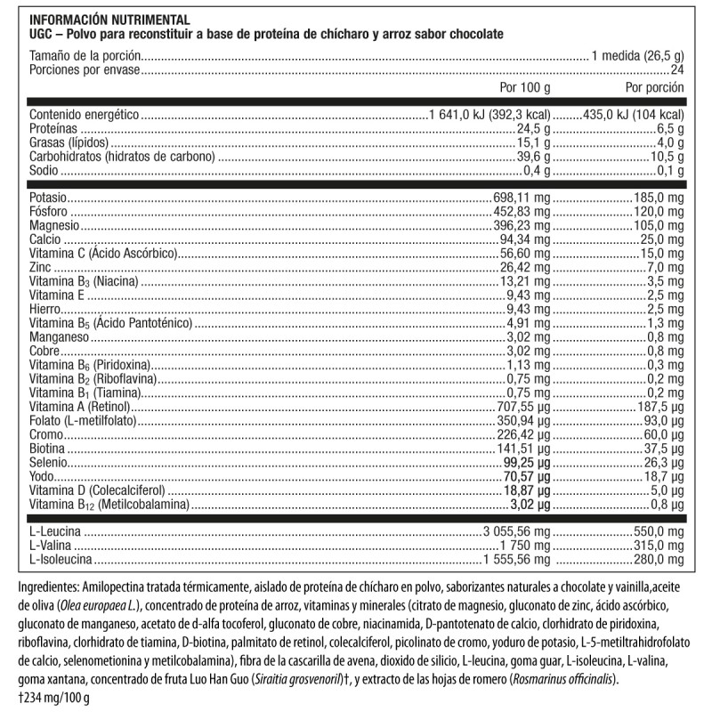 Amilopectina tratada térmicamente, aislado de proteína de chícharo en polvo (Pisum sativum), saborizante natural a chocolate, aceite de las semillas de girasol alto en ácido oleico (Helianthus annuus), concentrado de proteína de arroz, eritritol**, azúcar de caña orgánica, otros saborizantes naturales, citrato de magnesio, sílica, L-leucina, isomaltooligosacárido, goma guar, L-isoleucina, L-valina, goma xantana, mezcla de vitaminas y minerales (gluconato de zinc, ácido ascórbico, gluconato de manganeso, acetato de d-alfa tocoferol, gluconato de cobre, D-biotina, palmitato de retinol, niacinamida, colecalciferol, D-pantotenato de calcio, picolinato de cromo, clorhidrato de piridoxina, riboflavina, yoduro de potasio, clorhidrato de tiamina, L-5-metiltetrahidrofolato de calcio, selenometionina y metilcobalamina), y rebaudiósido A (del extracto de hoja de Stevia rebaudiana)***. **33 071 mg/100g ***185,7 mg/100 g