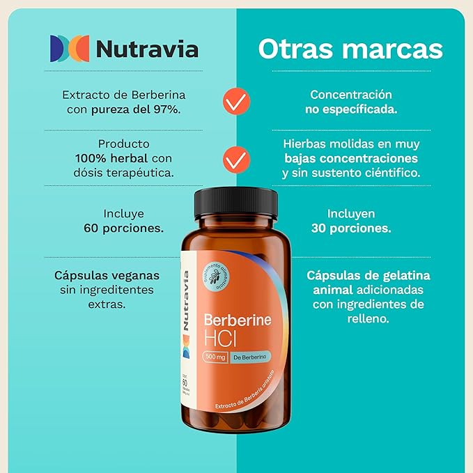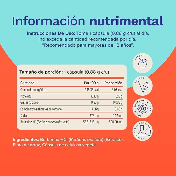 Berberine HC (Extracto), Fibra de arroz, capsula de celulosa vegetal.