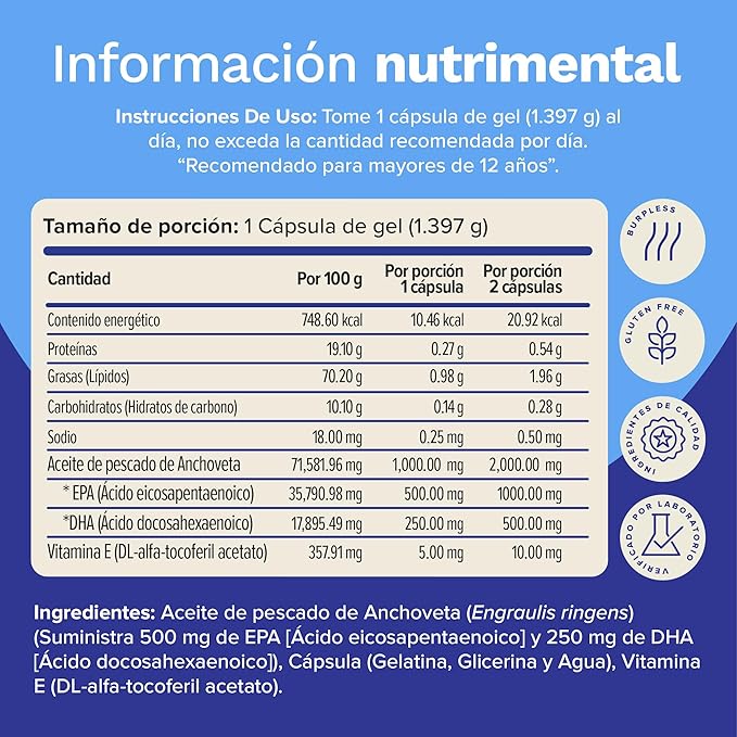 Aceite de pescado de Anchoveta (Engraulis ringens) (Suministra 500 mg de EPA [Ácido eicosapentaenoico] y 250 mg de DHA [Ácido docosahexaenoico]), Cápsula (Gelatina, Glicerina y Agua), Vitamina E (DL-alfa-tocoferil acetato)